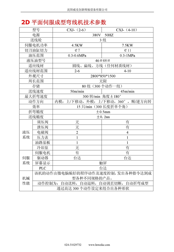 2D平面伺服弯线机: 本设备设计理念:以机器代替人工,无需调直材料,无需开模即可生产。您需要弯什么形状,只要它是在一个平面上,我们的机器都可以满足您的需求� 适用于铁线、钢线、不锈钢线及有色金属线材(圆、方、扁线),打(弯制)方、圆、六角、椭圆用不规则形状和各种平面扣类,各式挂钩等� 2D平面伺服成型弯线机机器原� 1、伺服成型弯线机设备选用细分驱动器控制高精度步进电机送线,机械传动选用精密齿轮连接,永远保持不变的送线精度和送线速度� 2、剪切油缸液压站配备强制风冷散热器,加倍延长液压系统元件的使用寿命� 3、控制系统采用PLC与文本显示器连接,既方便操作,又保证了控制系统的稳定性,而且设计有生产数量预置功能控制整机运行。由精密步进电机驱动送线轮转动,用PLC与文本显示器代替步进电机控制器,可以根据需要任意修改步进电机缓升缓降曲线与步进电机最高转速,杜绝了机械传动的冲击,绝对保证了实际传送铁线长度与理论计算长度一致; 4、伺服成型弯线机在设计预算时,已经把每MM长度分为10段脉冲,进一步确保了长度精度的设置;可调液压油缸剪切,可以保证圆圈切口的整齐性,剪切时间和退刀时间均可以在文本显示器上直接修改� 5、伺服成型弯线机设计有手动慢速送料、慢速退料功能,操作简便、减少材料损耗�
